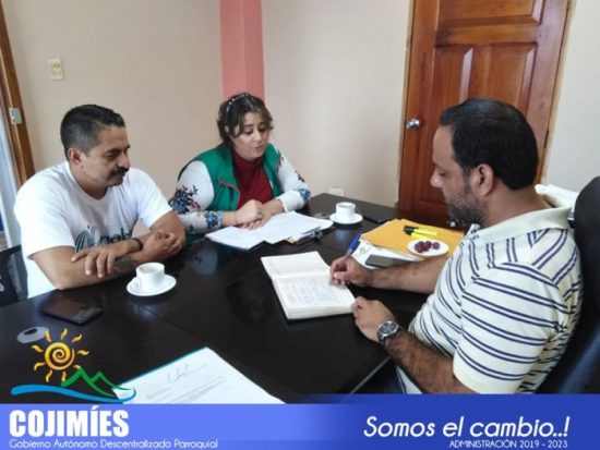 Luís Andrade García, presidente del Gobierno Parroquial de Cojimíes y representantes de la oficina de participación ciudadana del Gobierno Provincial de Manabí, en reunión de trabajo dieron a conocer algunas herramientas técnicas para aplicar en territorio con el objetivo de hacer un levantamiento de información de las parroquias e intervenir las necesidades básicas insatisfechas.
