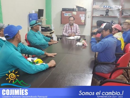 Dentro de las primeras acciones de la actual administración, el presidente de Junta Parroquial de Cojimíes, Luís Andrade García; mantuvo una reunión con los funcionarios de la Municipalidad de Pedernales que la realizan la tarea aseo y limpieza en la parroquia, la intención es conocer las necesidades y apoyarlos en su jornada diaria.