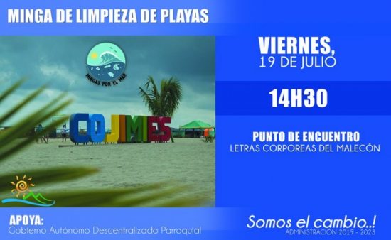 Todos Somos CojimíesPor agadcojimies / 19 julio, 2019 Participemos de la minga de limpieza de playas..! Apoya el Gobierno Parroquial de Cojimíes.